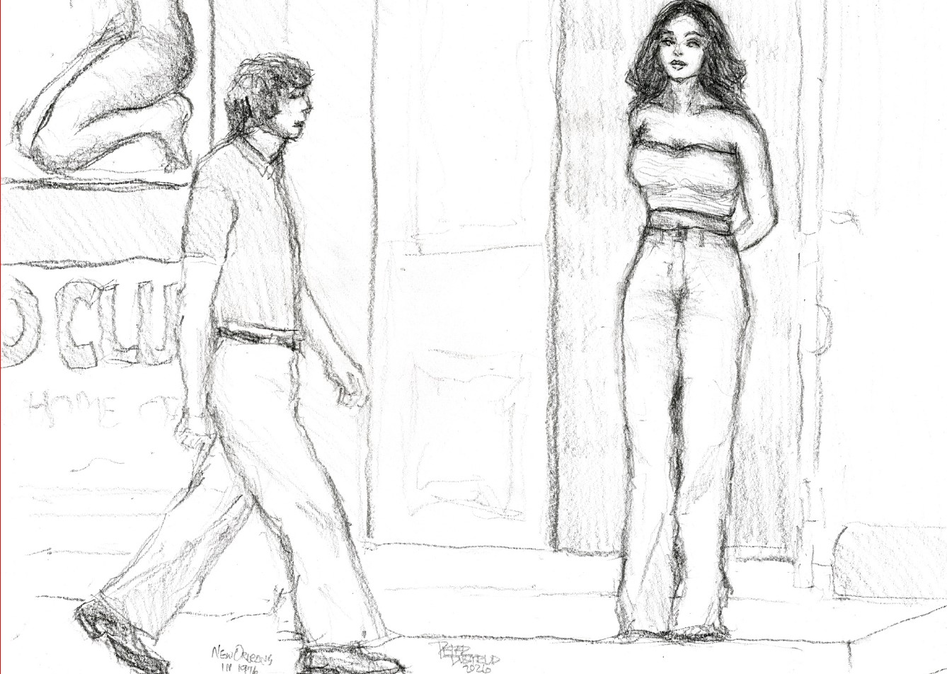 Pencil sketch outside a club after my original references of June 1976